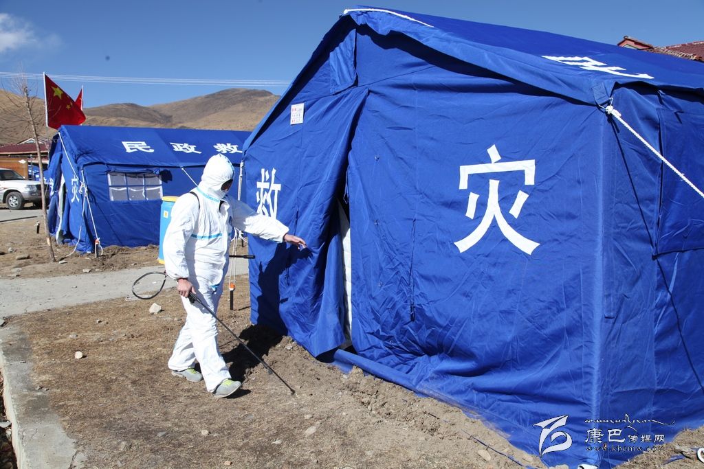 在離武警武警四川總隊(duì)二支隊(duì)的醫(yī)務(wù)站不遠(yuǎn)的地方,新都橋中心衛(wèi)生院的衛(wèi)生員羅衛(wèi)強(qiáng)正“全副武裝”的為每一頂帳篷做著消毒。羅衛(wèi)強(qiáng)說(shuō):“我們從地震第一天到現(xiàn)在一直堅(jiān)守在一線,22日到26日都在祖慶小學(xué)進(jìn)行消毒工作,27日和其他工作人員換班到了江巴牧民新村安置點(diǎn)。我們每天會(huì)早上一次,晚上一次對(duì)每一間帳篷進(jìn)行兩次消毒。除了我們,康定縣疾控中心的工作人員還會(huì)每天進(jìn)行一次消毒,我們都在盡最大的努力保證牧民生活環(huán)境的衛(wèi)生。”在對(duì)環(huán)境進(jìn)行消毒后,他又來(lái)到醫(yī)療就助點(diǎn)為前來(lái)就醫(yī)的甲瑪它看起病來(lái)。