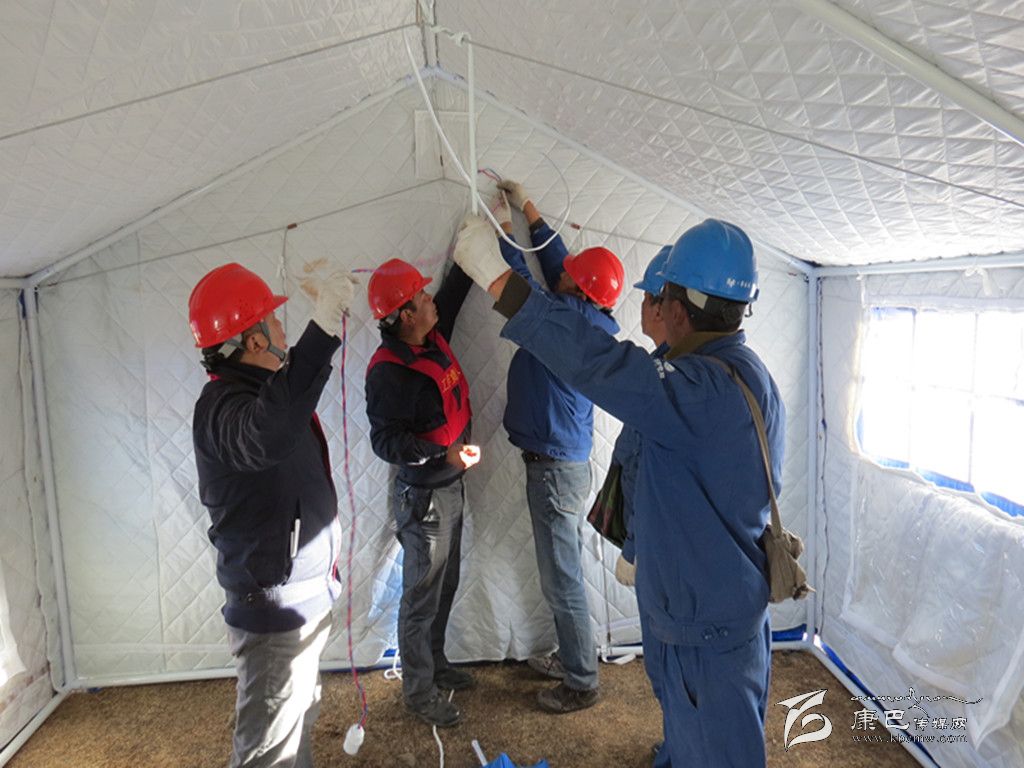 奪拉二村有4個變壓器臺區(qū),其中2個臺區(qū)為人員較多的木雅祖慶學(xué)校,地震使學(xué)校住宿樓變?yōu)槲7?,全校?000名學(xué)生轉(zhuǎn)移至學(xué)??盏厣系陌仓命c。為了讓安置點內(nèi)的受災(zāi)師生和應(yīng)急指揮中心盡快用上電,黨員突擊搶險小分隊不僅要在安置點迅速安裝應(yīng)急照明設(shè)施,同時還要從圍墻和學(xué)校食堂的樓頂上重新布放近3段2公里長的臨時電源線。學(xué)校圍墻因地震而搖搖欲墜,稍微用點力,墻、磚塊或水泥就會掉下來,面臨這一難題,公司黨總支沉著應(yīng)對,迅速組織塔公供電所與新都橋供電所的黨員干部趕往震中,同時安排其余供電所的黨員干部迅速增援。先期到達的救援人員在余震不斷發(fā)生的情況下,對受損供電設(shè)備及線路進行了緊急處理;在后期人員趕到后,公司黨總支迅速研究制定工作方案,科學(xué)分工:第一組黨員突擊搶險隊負責隱患排查,第二組黨員突擊搶險隊負責電線布放,第三組黨員突擊搶險隊負責救災(zāi)帳篷的照明安裝。在三個小組隊員的共同努力下,用近三個小時的時間就解決了應(yīng)急指揮中心、醫(yī)療隊和臨時安置點的照明安裝這一難題。