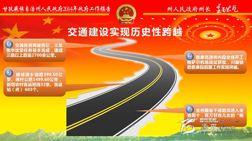 交通建設(shè)實(shí)現(xiàn)歷史性跨越。交通投資再破百億,建成三級以上路面2700余公里。雅康高速州內(nèi)段全線開工,格薩爾機(jī)場場址獲批,川藏鐵路雅康段前期工作實(shí)現(xiàn)突破。建成通鄉(xiāng)油路399.5公里、通村公路1499.6公里,新增農(nóng)村客運(yùn)班線32條、客運(yùn)站(點(diǎn)) 683個。全州國省干道路況進(jìn)入全省前十。徹底告別無電鄉(xiāng)歷史。完成投資100億元,“電力天路”等項目順利實(shí)施,“川藏聯(lián)網(wǎng)” 工程提前半年建成投運(yùn);18個縣實(shí)現(xiàn)與主網(wǎng)連網(wǎng);“遠(yuǎn)村點(diǎn)亮”全面完成。城鄉(xiāng)面貌煥然一新。堅持建好縣城,全州市政基礎(chǔ)設(shè)施有效提升。堅持做大集鎮(zhèn),改造小城鎮(zhèn)危舊房1118戶;投入1.34億元完善姑咱、馬尼干戈、香格里拉、八美4個省級“百鎮(zhèn)試點(diǎn)”鎮(zhèn)市政設(shè)施,13個鄉(xiāng)獲準(zhǔn)撤鄉(xiāng)建鎮(zhèn)。堅持做美村寨,成功創(chuàng)建45個省級“美麗鄉(xiāng)村”示范村,19個州級幸福美麗新村試點(diǎn)建設(shè)全面啟動,打造新村聚居點(diǎn)235個,建成藏區(qū)新居1.11萬戶。全州城鎮(zhèn)化率達(dá)到27%。通信覆蓋越來越廣。完成投資4.53億元,國省干線和主要旅游景區(qū)通信網(wǎng)絡(luò)實(shí)現(xiàn)連續(xù)覆蓋。生態(tài)底色更加鮮明。編制完成《甘孜州生態(tài)文明建設(shè)規(guī)劃》,落實(shí)國家生態(tài)功能區(qū)轉(zhuǎn)移支付資金6.8億元,生態(tài)保護(hù)與建設(shè)工程加快推進(jìn),草原植被、森林覆蓋率分別達(dá)到78%、33.04%。