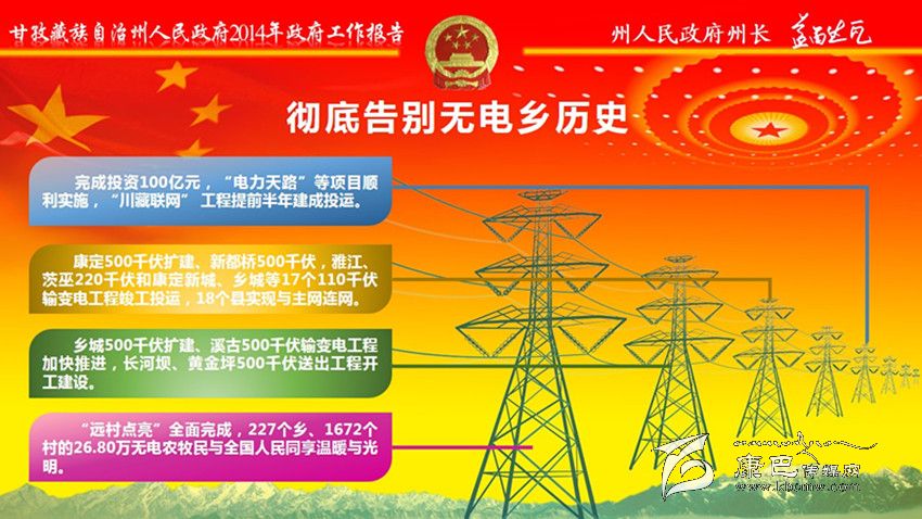 大力推進(jìn)電力通信建設(shè)。投入20億元,加快實(shí)施“電力天路”、無電地區(qū)電力建設(shè)新增項目和農(nóng)網(wǎng)改造升級工程,切實(shí)緩解邊遠(yuǎn)地區(qū)群眾缺電問題;完成長河壩電站500千伏等3個輸變電項目;統(tǒng)籌抓好表后入戶工程,確保群眾安全用電。投入6億元,新建通信光纜2360公里、基站1025個,解決國省干道、旅游景區(qū)景點(diǎn)信號盲區(qū);新增30個自然村通電話、545個行政村通寬帶,出口總帶寬達(dá)到82G。