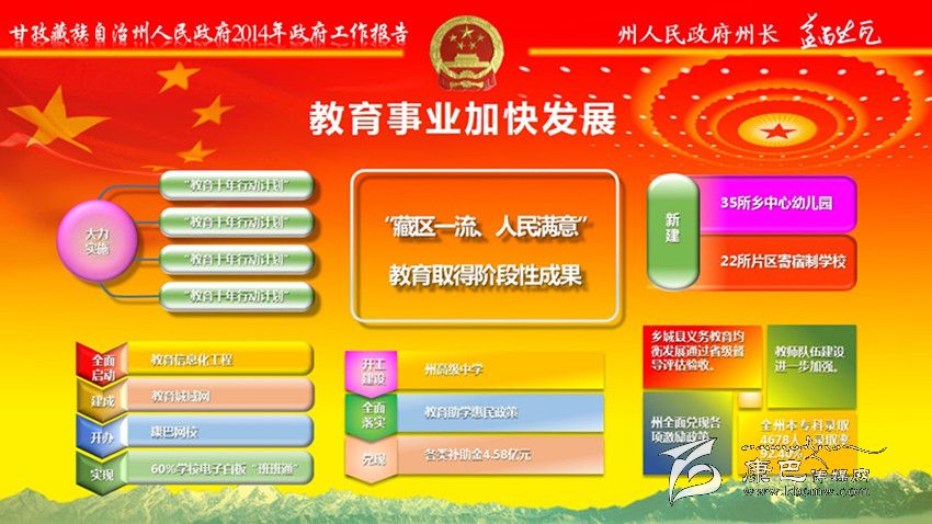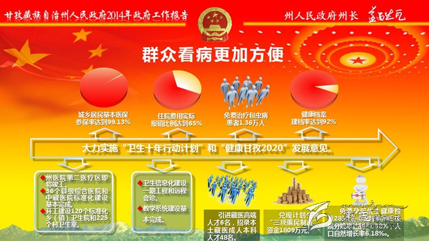 加大民生投入,全年民生支出139億元。全州城鎮(zhèn)新增就業(yè)7400人,城鄉(xiāng)低保實(shí)現(xiàn)應(yīng)保盡保;在全省民族地區(qū)率先實(shí)施醫(yī)療保險制度城鄉(xiāng)統(tǒng)籌,異地就醫(yī)即時結(jié)算全面啟動;在全省率先出臺大病醫(yī)療保險規(guī)定。教育事業(yè)加快發(fā)展。新建35所鄉(xiāng)中心幼兒園、22所片區(qū)寄宿制學(xué)校,州高級中學(xué)開工建設(shè)。全面落實(shí)教育助學(xué)惠民政策,兌現(xiàn)各類補(bǔ)助金4.58億元。城鄉(xiāng)居民基本醫(yī)保參保率達(dá)到99.13%,健康檔案建檔率達(dá)到92%;開工建設(shè)120個標(biāo)準(zhǔn)化鄉(xiāng)(鎮(zhèn))衛(wèi)生院和225個村衛(wèi)生室;衛(wèi)生信息化建設(shè)一期工程和遠(yuǎn)程會診、教學(xué)系統(tǒng)建設(shè)基本完成;兌現(xiàn)計劃生育“三項惠民制度”資金1809萬元。群眾文化生活日益豐富。建成縣“兩館”12個;開工建設(shè)州民族體育館、州農(nóng)牧民演藝培訓(xùn)中心和14個縣級全民健身中心,建成農(nóng)民體育健身工程739個;開展 “送文化下鄉(xiāng)”近千場;康巴文化研究院“四大工程”全面啟動。深入實(shí)施“百千萬康巴英才工程”,人才科技工作扎實(shí)有效。扶貧移民工作成效明顯。完成1360個貧困村、19.91萬扶貧對象立卡建檔工作;實(shí)施整村推進(jìn)63個、連片開發(fā)項目4個、彝家新寨(村)17個、索改橋23座,易地扶貧搬遷9850人,2.65萬群眾生產(chǎn)生活條件得到改善。