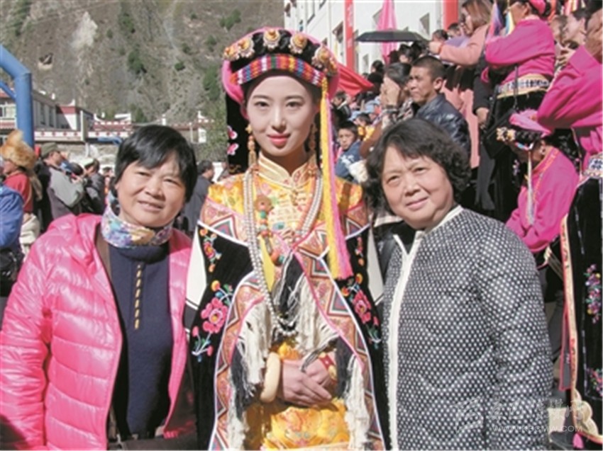 游客與丹巴美女合影。本報記者 蘭色拉姆 攝