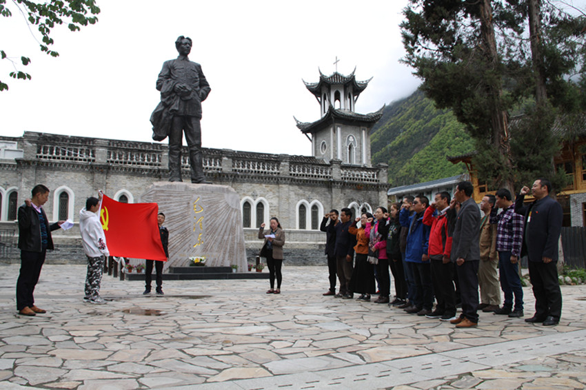 本網(wǎng)訊 (本網(wǎng)記者 秦松 攝影報道)日前,甘孜日報社全體黨員與群眾工作全覆蓋結(jié)對共建共創(chuàng)的海螺溝燕子溝鎮(zhèn)的躍進坪村支部、南門關(guān)村支部、麻柳林村支部、喇嘛溝村支部的黨員,懷著崇敬的心情來到磨西長征紀念館毛主席塑像前,舉行緬懷革命先烈、重溫入黨誓詞活動?;顒又校h員們還與共建共創(chuàng)支部黨員進行了座談。圖為宣誓活動現(xiàn)場。