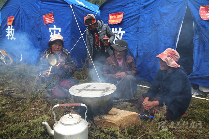 曲珍、曲西和幾個(gè)伙伴正在燒著開水?!斑@是到安置點(diǎn)后我第一次生火。前兩天吃干糧喝礦泉水,讓喝慣了酥油茶的我們很不適應(yīng)?!鼻湔f。