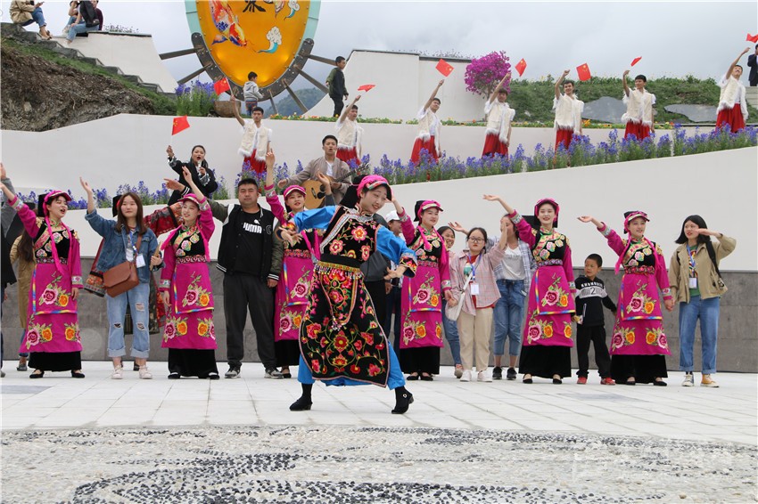 圖為康定市麥崩鄉(xiāng)日央村魚通官寨開園儀式上,游客和村民一起表演。