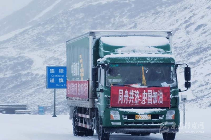 圖為甘孜郵政頂風(fēng)冒雪逆行為八美鎮(zhèn)運送防疫物資。