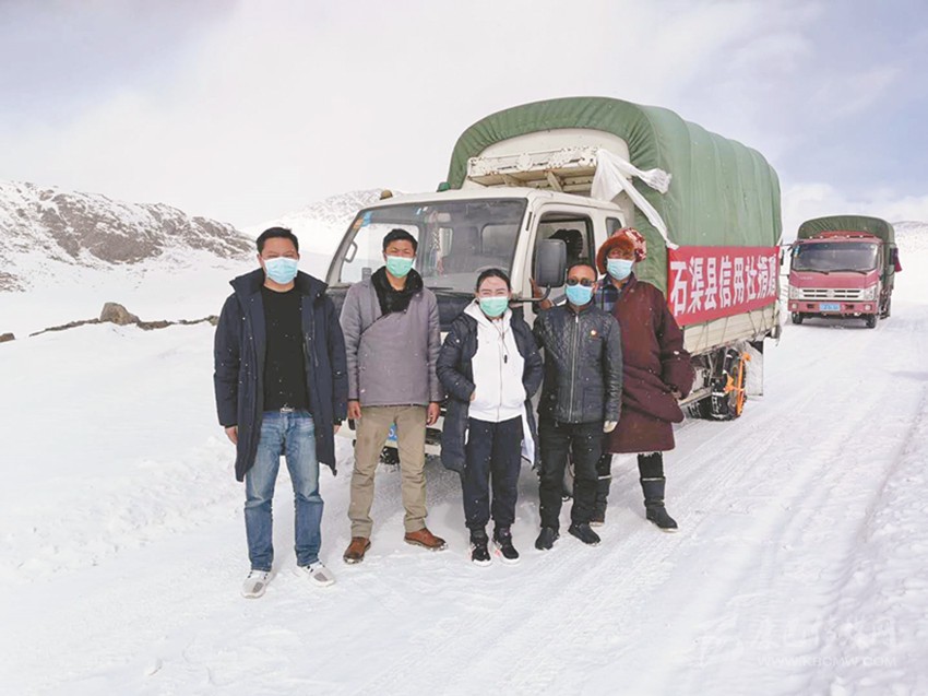 石渠縣信用社員工冒著漫天大雪為群眾捐贈蔬菜。