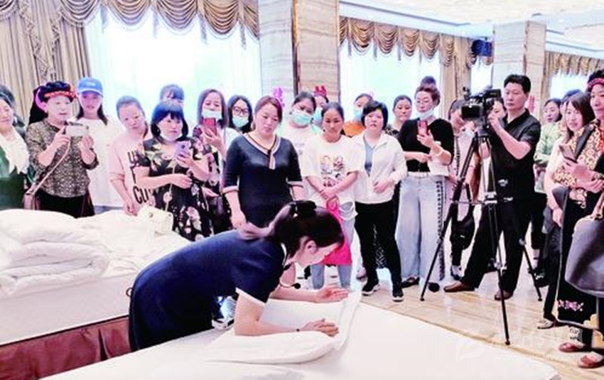 先檢查床箱與床墊是否吻合,床墊拉出40公分,鋪床前撣去床上毛發(fā),接下來開始甩單,床單正面朝上,床單中線居中,兩邊吊邊均等,甩單動(dòng)作簡單瀟灑,準(zhǔn)確到位。這是7月8日,稻城縣文旅行業(yè)從業(yè)人員培訓(xùn)會(huì)上,筆者見到學(xué)員在教師的指導(dǎo)下表演的精彩一幕。