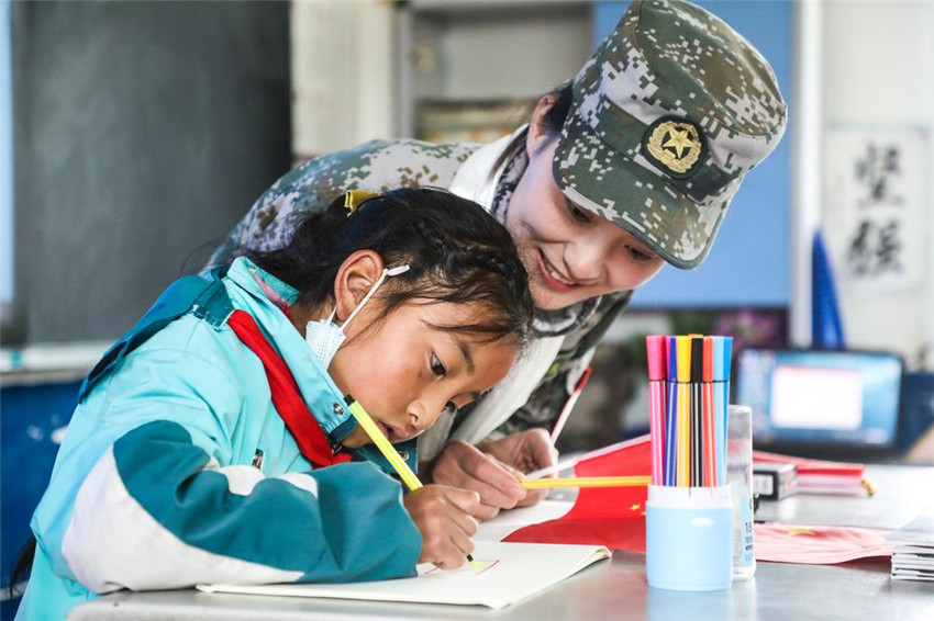 圖為部隊工作人員正在輔導(dǎo)學生畫國旗。