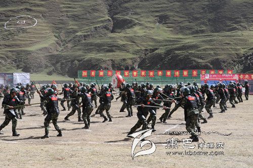 在實戰(zhàn)技能演練中,各單位都表演了自己的拿手絕技:由武警甘孜州支隊雪山飛虎隊20名官兵演練的特種射擊;武警四川總隊第二支隊演練的格斗術;中國人民解放軍甘孜軍分區(qū)獨立營120名官兵演練刺殺操;武警甘孜支隊一大隊和三大隊200名官兵演練的防暴對抗;雪山飛虎隊隊員帶來的硬功表演;州公安局特警支隊特警演練的“雪狼十七式”、摔擒配套動作、實戰(zhàn)對抗。據了解,“雪狼十七式”是甘孜公安特警通過六年來在高原維穩(wěn)駐訓、處置突發(fā)事件,摸索出來的摔擒動作,具有極強的殺傷力,能瞬間制敵。它是我州特警隊員實戰(zhàn)中克敵制勝的法寶,是特警隊員必備的基本功。