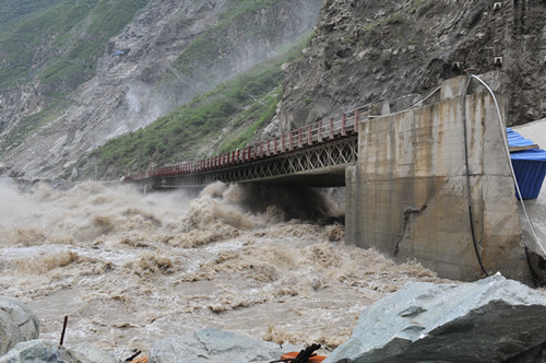 6月29日,恰逢周末,但在該公司的防汛指揮中心已是繁忙緊張氣氛,防汛值班員雖已熬紅了雙眼,緊盯著監(jiān)視屏并時刻保持與前方的聯(lián)系;7時23分,該公司副總經(jīng)理杜三林,長河壩工程部、安全環(huán)保部相關(guān)負責(zé)人來到了指揮中心;8時,流量逼近4170立方米每秒;10時,流量超過4200立方米每秒,已超過該工程自2010年開工以來最大流量,整個指揮中心的氣氛變得隨之凝重起來;10時30分至11時,指揮中心接連收到施工單位電話險情報告:此時此刻,長河壩工程初期導(dǎo)流洞水勢兇猛,導(dǎo)流洞出口橋0號橋臺回填料淘刷嚴(yán)重,1號橋墩發(fā)生傾斜,橋梁隨時有傾覆的可能,將會危及下游圍堰高程最低的中水十四局、中水五局營地的安全,更將會危及到300余名員工的人身安全;金湯河突發(fā)特大洪水,沖垮了通往金湯土料場的場內(nèi)公路,沿線山體已發(fā)生了小型泥石流,土料場通訊、交通已全部中斷,急需救援;持續(xù)降雨引發(fā)響水溝泥石流,3萬余立方米泥石流堆積物順溝而下,沖垮了響水溝石料場的鋼橋,并堵塞了場內(nèi)12號路1號隧道。必須馬上清運疏通,否則,響水溝再發(fā)泥石流,長河壩上游圍堰和大壩填筑工作面將直接面臨泥石流堆積物的直接沖擊,險情萬分緊急!