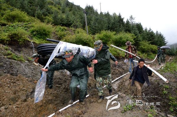 “非常感謝武警官兵!如果不是你們幫忙,我們的‘引水到村’計劃將一再推遲,影響村民的用水……”老榆林村村長項康玉感激地對官兵說。老榆林村原來的自來水飲用水源現(xiàn)已不夠用了,村民吃水面臨時斷時有的問題,為保證村民飲用水供應,由政府出資一部分,村民集資一部分,村里決定利用山頂常年的冰雪融水作為水源。前期,老榆林村已請工程隊挖好山頂至村子的2000余米的管線溝,由于連日陰雨,加之山高路險,鋪設管線工程的事一拖再拖,以致挖好的管線溝多處被雨水沖下的泥石填埋,嚴重影響飲水工程的竣工時間。村民們心里都很著急,但村里的年輕人大部分都外出打工,留守的大多是婦幼,抽不出勞力,村長項康玉無奈之下求助武警官兵。武警四川省總隊二支隊領導得知情況后,第一時間派出官兵投入老榆林村自來水管線鋪設工程。