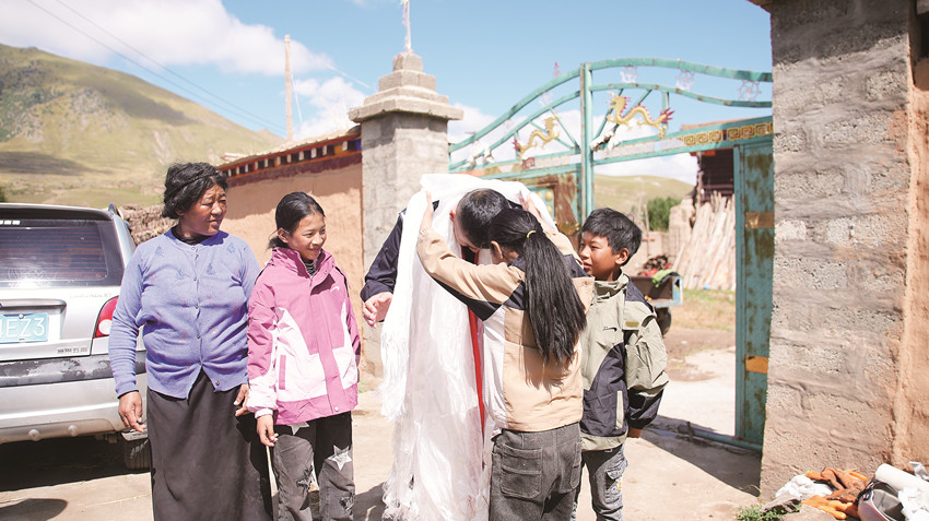早晨8時(shí)出發(fā),11點(diǎn)半才抵達(dá),中扎科鎮(zhèn)是德格縣最偏遠(yuǎn)的鄉(xiāng)鎮(zhèn)。向三仟一下車,呷措便捧著哈達(dá),眼含熱淚迎了上來,施以藏族最高禮儀——碰頭禮來敬獻(xiàn)哈達(dá),她的姐姐也不斷道著感謝:“當(dāng)時(shí)醫(yī)生從她肚子里取出的腫瘤和感染包蟲的組織加一起快有二十斤了,要不是你,她當(dāng)年怕就沒命了!”向三仟回憶起此事也是感觸頗多,輕輕拍拍呷措的肩膀,鼓勵(lì)著:“你命大,肯定沒事,以后福氣還多著呢!”