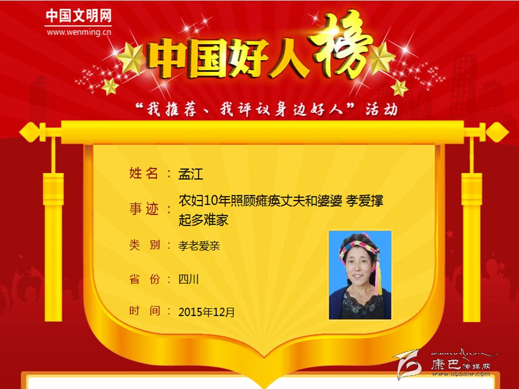 本網(wǎng)訊(丹巴縣委宣傳部)近日,從中央文明辦主辦、中國文明網(wǎng)承辦的“我推薦、我評議身邊好人”活動(dòng)中傳來喜訊,最美媳婦孟江10年照顧癱瘓丈夫和公婆,孝愛撐起多難家入選“中國好人榜”。