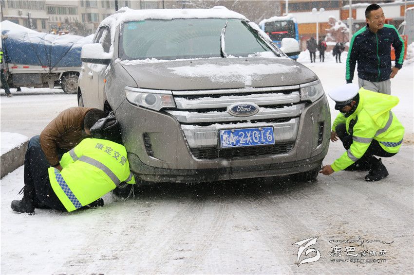 康定交警大隊城區(qū)中隊的扎西澤仁立即走上前去詢問:“前面更滑,你肯定上不去,有沒有鏈條?”車主譚光復隨即下車答道:“有,可是不會上。”