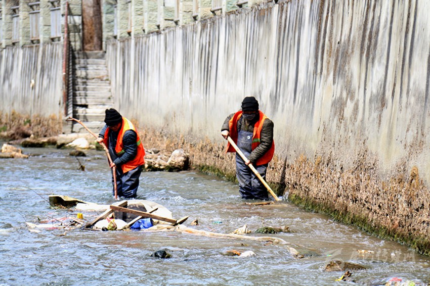 連日的“倒春寒”使康定這座高原城市仿佛遲遲未能邁過冬天的門檻。3月12日,又一個(gè)充滿寒意的周日。清晨6時(shí),整個(gè)城市還籠罩在一片夜色中,零下8攝氏度的氣溫似乎要將一切凝固,只有嘩嘩流淌的河水穿城而過。從將軍橋眺望折多河上游,幾個(gè)微黃的小點(diǎn)在水里緩慢移動(dòng)著。7時(shí)30分,隨著“小黃點(diǎn)”慢慢放大,河道保潔工人的身影漸漸清晰。在刺骨的激流中,他們身著連體膠褲,時(shí)而俯身撿拾垃圾,時(shí)而舉臂托起背簍,時(shí)而牽手共同邁過滑石?!昂螏煛⑿?、鄭老六……”,這是8名河道清運(yùn)工平日里對(duì)彼此的稱呼,每日11小時(shí)的高強(qiáng)度“水中作業(yè)”,他們已經(jīng)堅(jiān)持了34天。