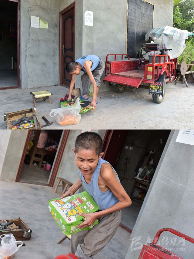 “周強善曾是全鄉(xiāng)最困難的貧困戶。”中心鄉(xiāng)黨委書記楊壘說,周強善的妻子在剛生下女兒后因病去世。2005年,他在外務工時右腿受傷,留下殘疾。后來他自學補鞋技術(shù),成了一名鞋匠,但腿腳不便、下山路不通,三娃多年“悶”在家里。