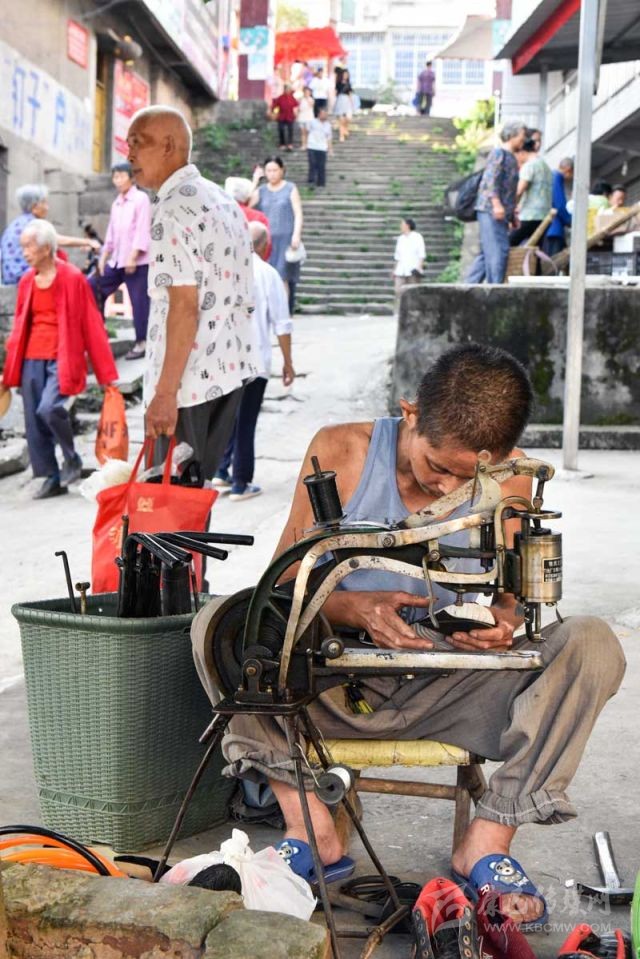 周強善把機動三輪車停到文化街上一家無名超市的門前,將縫紉機等工具一件件搬下來,就著臺階擺起了攤子。