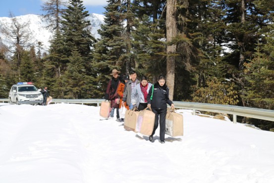 因近日天氣變化浪中村路面積雪過多,工作組棄車步行手提贈送物資前往浪中村,到達浪中村后,工作組了解結對戶生產(chǎn)生活情況、贈送棉被并向村民宣講脫貧攻堅政策。