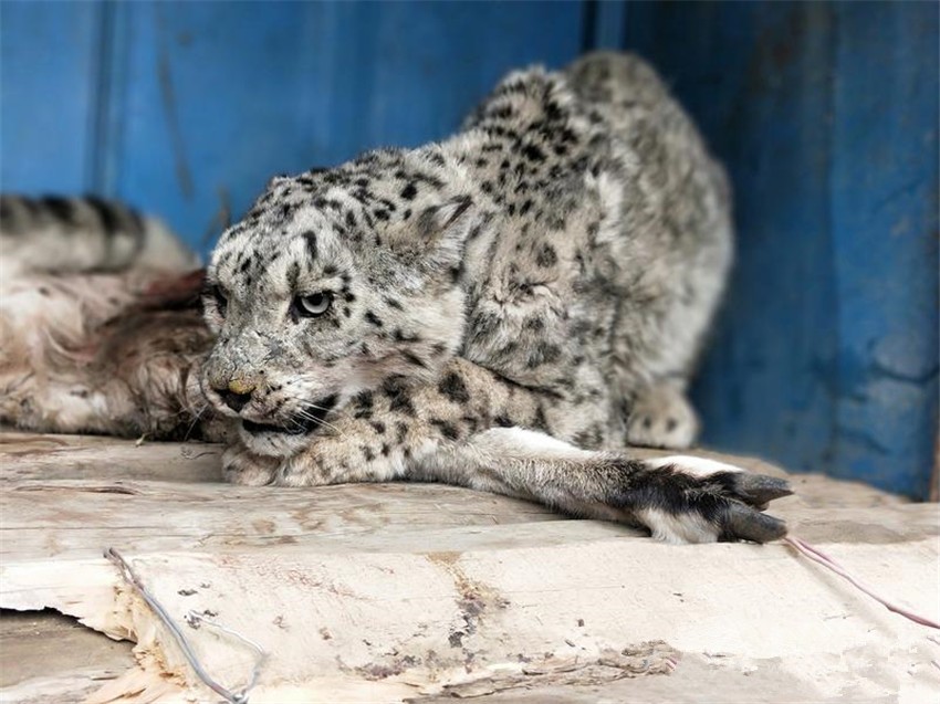 不放心受傷雪豹的隊(duì)員們隨即將發(fā)現(xiàn)的情況按屬地管理原則上報(bào)了該鄉(xiāng)黨委政府,聯(lián)系了行業(yè)主管部門林草局,并上報(bào)縣委縣政府,縣委政府主要領(lǐng)導(dǎo)高度重視要求鄉(xiāng)黨委政府和林草局賡即組織人員再到現(xiàn)場(chǎng)附近搜尋受傷雪豹看是否需要救治。當(dāng)一行人再次來(lái)到現(xiàn)場(chǎng),發(fā)現(xiàn)受傷的雪豹可能由于舍不得“獵物”去而復(fù)返正趴在巖羊旁,也可能由于傷情見人前來(lái)并未離去。大家在簡(jiǎn)單商議后,決定先由獸醫(yī)為雪豹現(xiàn)場(chǎng)查驗(yàn)傷勢(shì)。為防止雪豹傷人,在大家的配合下做出必要的防護(hù)措施后,開始為雪豹查驗(yàn)傷勢(shì),經(jīng)查驗(yàn)發(fā)現(xiàn)該雪豹左前肢和左后肢均被咬傷,其中左前肢受貫穿性咬傷,傷勢(shì)較重,造成其無(wú)法行走,隨即大家決定將雪豹帶回救治。
