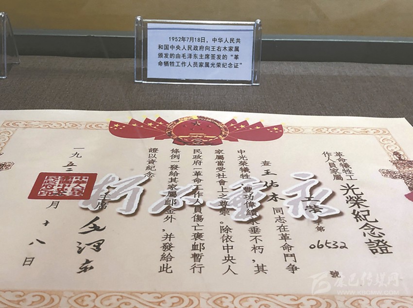 1952年7月18日,中華人民共和國中央人民政府向王右木家屬頒發(fā)的由毛澤東主席簽發(fā)的“革命犧牲工作人員家屬光榮紀念證”。 李睿 攝