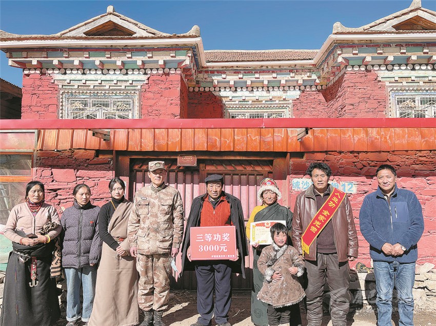 圖為慰問(wèn)組一行向瑪桑父母送上三等功喜報(bào)和慰問(wèn)金。