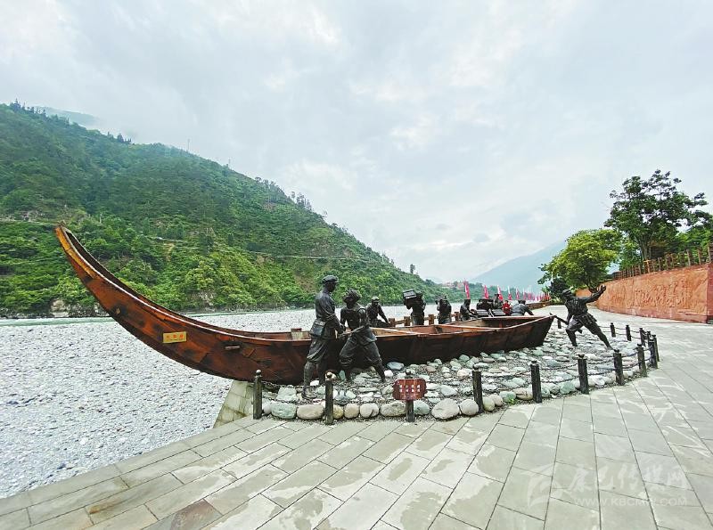 不遠(yuǎn)處的安順場渡口、大渡河邊,矗立著一座“紅軍渡”石碑,上面的三個鮮紅大字由渡河時任第一軍團(tuán)第一師一團(tuán)團(tuán)長楊得志題寫。石碑旁陳列著的一艘長10.5米、寬2.3米、高2.2米的“紅軍船”,正是當(dāng)年紅軍強(qiáng)渡大渡河時使用的翹首木船復(fù)制品。木船旁,是戰(zhàn)士和當(dāng)?shù)卮兿蚰敬\(yùn)送武器裝備的雕像,斜坡上,勇士隊(duì)伍正奔向渡口。