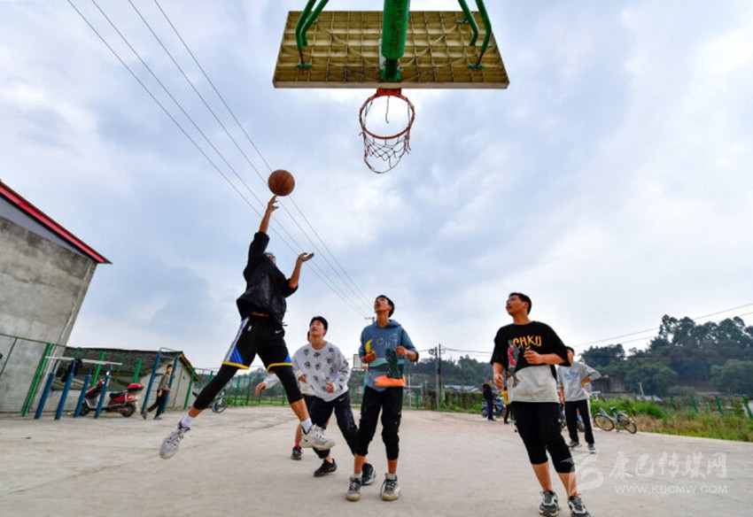 ? 東坡區(qū)松江鎮(zhèn)丁塘村村民正在村籃球場上進行一場3對3對抗賽。丨眉山日報全媒體記者 楊槐 攝