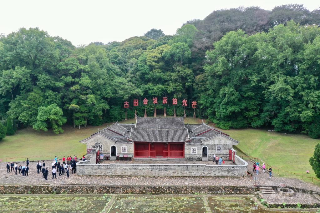 游客在福建省龍巖市上杭縣古田鎮(zhèn)古田會議會址參觀(2021年5月9日攝,無人機(jī)照片)。新華社記者姜克紅攝