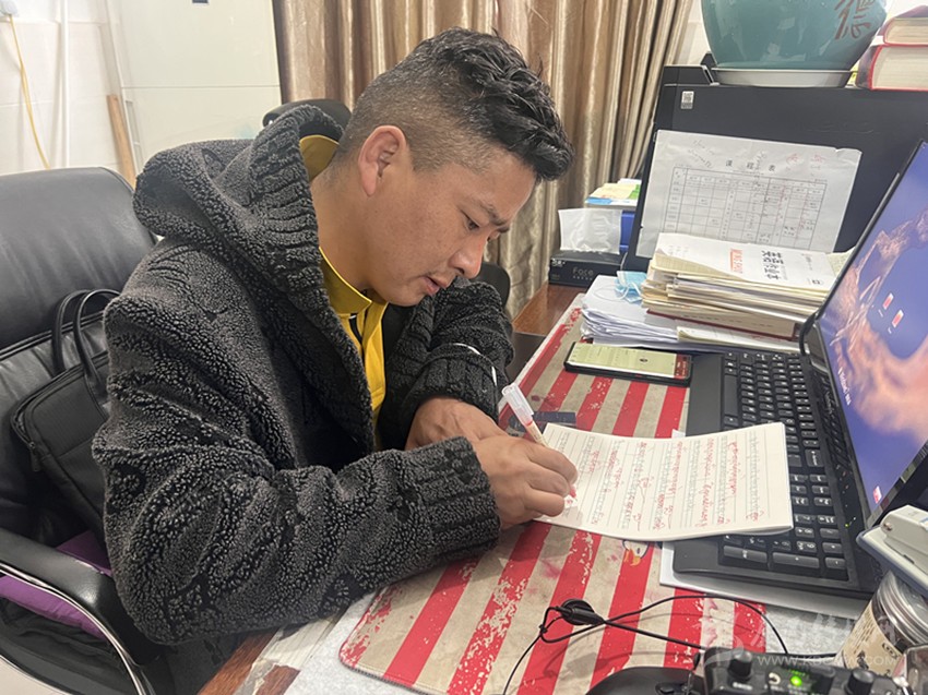 “尼瑪老師不僅對(duì)學(xué)生的學(xué)習(xí)生活關(guān)懷備至,作為任課教師,我們常??吹剿谛菹r(shí)間認(rèn)真?zhèn)湔n。他會(huì)聲情并茂地大聲誦讀精心準(zhǔn)備的課件,大家都覺(jué)得很有趣,學(xué)生學(xué)習(xí)的積極性也提高了。他批改作業(yè)也非常認(rèn)真,給每一位同學(xué)寫(xiě)的評(píng)語(yǔ)都用心用情。他是真的是用全部身心來(lái)對(duì)待工作,不愧是一名優(yōu)秀的老師。”采訪過(guò)程中,筆者偶遇了援建教師廖俊希,談起對(duì)章拉尼瑪?shù)挠∠?,廖俊希的評(píng)價(jià)細(xì)致而中肯。