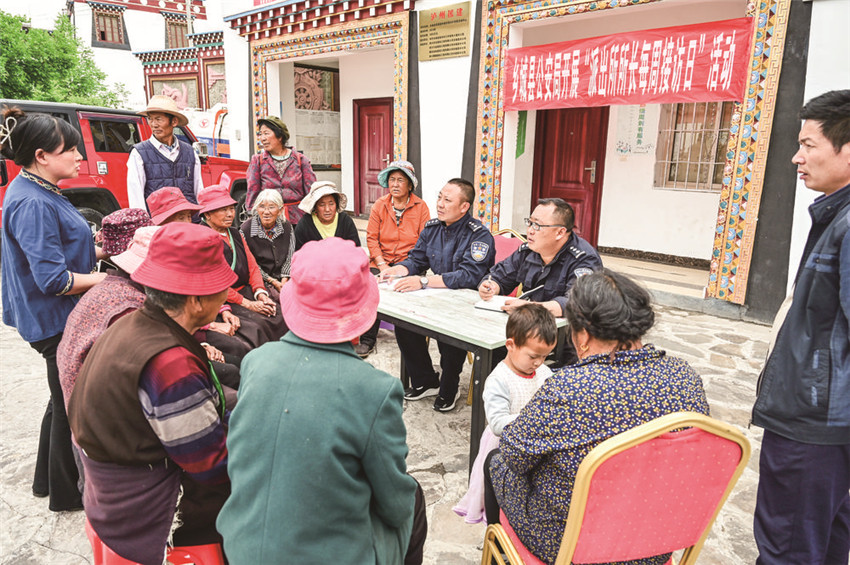 純白的藏房,被黃綠交錯(cuò)的梯田簇?fù)碇筷赝高^薄霧,灑向山坳,勤勞的村民在田間勞作,眼前是一副如詩如畫的香巴拉風(fēng)光。平安是最美的風(fēng)景,在這田園牧歌般的美景背后,鄉(xiāng)城縣公安局的衛(wèi)士們以實(shí)際行動(dòng)勾畫出一幅守護(hù)一方平安的“警民和諧圖”。