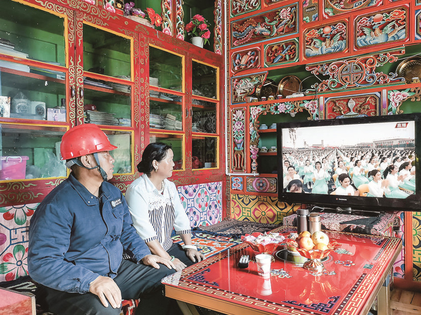 土登尼瑪處理完用戶開關(guān)故障后,和用戶共同觀看慶祝建黨100周年大會。