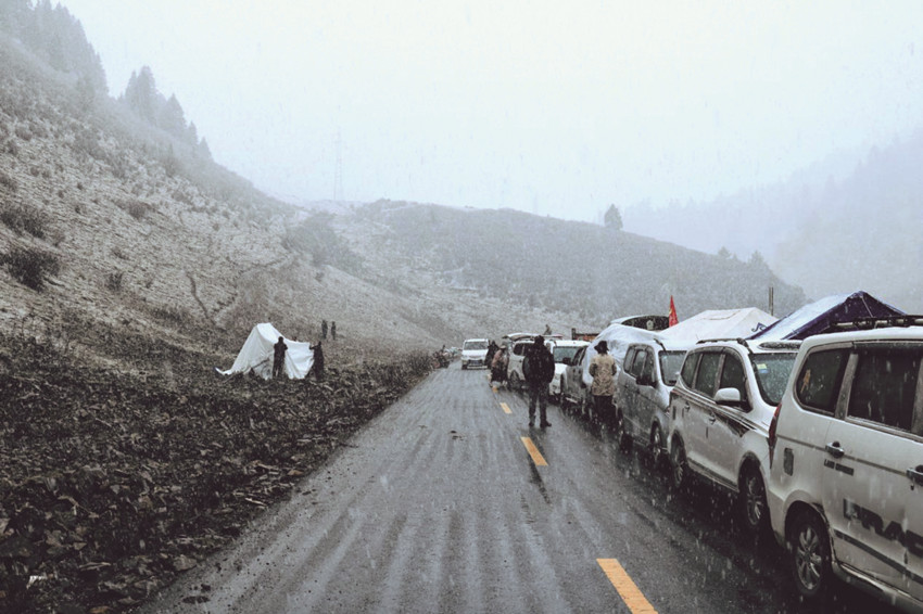 然而,高原的天、娃娃的臉,說(shuō)變就變。剛剛還艷陽(yáng)高照的晴好天氣,瞬間寒風(fēng)四起,鵝毛大雪不一會(huì)便覆蓋了整個(gè)山野。由于到達(dá)蟲(chóng)草采集點(diǎn)還需4、50分鐘人力轉(zhuǎn)運(yùn)物資,受天氣影響,前行受阻,擔(dān)任護(hù)送任務(wù)的民輔警當(dāng)即幫助群眾搭建臨時(shí)安置點(diǎn),風(fēng)雪中警民互助的身影像極了一家人。一切收拾停當(dāng),盡管風(fēng)寒雪大,條件艱辛,樂(lè)觀的群眾和伴隨服務(wù)的民輔警還不忘在風(fēng)雪中來(lái)一張合照,他們說(shuō),這是歷年來(lái)的慣例,每次上山采集蟲(chóng)草和下山返程,他們都會(huì)一個(gè)不少地拍張“全家福”,以此留念蟲(chóng)草季警民相依的美好記憶。