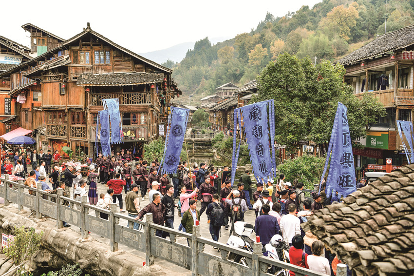 在貴州省黎平縣肇興侗寨,侗族群眾身穿節(jié)日盛裝參加侗年巡游活動。