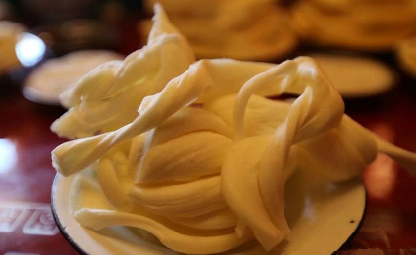 奶餅在木雅地區(qū)的種類較多,一種是用未提煉酥油的奶酪制成,不帶酸味,稱“甜奶餅”,形同小鍋盔,有兩層較厚的酪皮;另一種是“麻花絞”奶餅形同麻花,撕開呈纖維狀,是用提煉過酥油的奶酪制成;還有一種是各地都普遍制作的“本脫”,呈坨狀;將“本脫”揉搓成顆粒狀,曬干即成奶渣。
