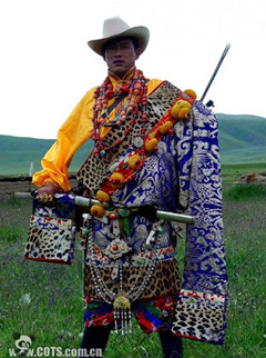 吐蕃時期   藏族服飾文化有了較大的發(fā)展。"中二丁王"時(相當(dāng)于中原西漢中期),南方雅隆河谷的吐蕃開始了冶煉鐵、銅、銀等礦產(chǎn),為金屬飾品的出現(xiàn)創(chuàng)造了條件。藏史記載,公元三世紀(jì)的拉妥妥日年贊時,吐蕃贊普的服飾巳與眾不同,出現(xiàn)了服飾等級的差異。史載松贊干布時期,吐蕃的歷史翻開了新的一頁,吐蕃文化得到迅速的發(fā)展,其服飾文化日漸發(fā)達(dá)。吐蕃奴隸制王朝等級森嚴(yán),在服飾上的表現(xiàn)也日臻完備。從反映吐蕃盛時的敦煌壁畫可看出,君臣服飾的等級差異,藏王一般只有贊普才能使用的三瓣寶冠箍住的有凹槽裝飾的無沿帽,呈紅色,通常高于一般人的帽子;藏王的侍從或臣下往往戴平頂無沿帽。衣袍的式樣也各有不同,官吏的章飾規(guī)定有一等瑟瑟,二等金,三等金包銀,四等銀,五等銅,六等鐵等大小兩類,共十二級,裝在方圓三寸的盒子里掛在胸前,以區(qū)別職位的高低。武將的頭盔有形如塔的裝飾,戰(zhàn)士頭盔上有三只彩旗以表示出生的年月,隨著"惟以淬礪為業(yè)"的吐蕃冶煉業(yè)的發(fā)展,軍隊的鎧胄日趨精良,有的周身僅露兩個眼窩,勁弓利刃常不能破,其威嚴(yán)、勇猛之氣在今天大昭寺壁畫的吐蕃武士像中尚歷歷在目。吐蕃貴族不僅本人穿著華貴,還在聚會宴客時,把傭人裝飾起來。而作為贊普的松贊干布則用一種紅帶子包頭,身著長袍,足穿腳尖朝上的靴子,據(jù)《紅史》載,這種王服是受波斯王朝的影響,反映了文化交往已影響到了服飾文化層次,而從松贊干布伊始的吐蕃與中原的密切交往,兩種民族文化的長期接觸更為藏族服飾的發(fā)展注入了新鮮血液。史載文成公主進(jìn)藏時,帶入諸種花緞、錦、綾羅與諸色衣料二萬匹,還有大量的金玉器具。松贊干布及吐蕃大臣紛紛自行去掉氈裘,改穿絹綺。近代西藏的高級官吏,頭發(fā)綰成一髻,戴金翅白紗帽,這是唐代進(jìn)士的服飾。此外,還采納文成公主建議,令國人禁止"赭面"(用油涂面),文成公主進(jìn)藏還帶來了種植蠶桑和紡織技術(shù),"植??椊z兮"大大的促進(jìn)了吐蕃服飾技藝的發(fā)展,青海海西州都蘭出土的大批吐蕃服飾文物,真實、生動地反映了吐蕃服飾的工藝水平。服裝的織物紋樣多為聯(lián)珠動物紋,裝飾品的金質(zhì)首飾、佩飾的精美使人嘆為觀止。今天藏族婦女飾品的鑲嵌形制,可以從這些文物中找到原型。斯坦因的《古代中亞文化遺跡》一書也曾提到:"在吐蕃發(fā)現(xiàn)的遺物中,有很多具有花紋的絲織物,花紋中有些是印的,有些是織的,花紋圖象的變化很多,這一點很可以表示吐蕃商業(yè)的地位,……大概是中國與西亞之間的貿(mào)易重點。"頻繁的交往促進(jìn)了吐蕃經(jīng)濟的發(fā)展,也促進(jìn)了服飾文化的發(fā)展。 吐蕃是一個軍事帝國,在它的發(fā)展過程中征服融合了青藏高原及其邊緣地區(qū)的許多其他民族,這是造成今天各地區(qū)藏族之間文化差異的重要原因。在服飾的表現(xiàn)上也是如此。吐蕃時代這種差異主要表現(xiàn)為東女、附國、黨項等部落服飾的不同,東女部落住在康延川(今昌都),處于母系氏族社會發(fā)展階段,其女王穿青毛綾(氆氌)裙,上披青袍,袖長到地,冬穿用文錦裝飾的羔裘。發(fā)作鬟髻狀,兩耳垂珰(耳環(huán))。足穿革素(皮靴)。一般男子披發(fā),婦女辨發(fā),男女都用彩色涂面。王死居喪三年,不易服,不梳洗。附國是以今四川甘孜為中心,包括今四川阿壩一帶的嘉絨藏人的藏羌融合體。他們頭戴圓形皮帽,或帶幕離佳(即面罩一類飾物,為婦女所帶)。身披毛曷毛(氆氌一類)、皮裘,穿牛皮鞋。頸系鐵索,手貫鐵釧。王與酋長以金為首飾,胸前掛著三寸長的金花。黨項則是純游牧部落,"服氈襲褐,披氈以為上飾",早在北周時巳能制造精美的犀甲、鐵鎧。四川西北部還有屬黨項部落聯(lián)盟的鄧至、武興國和宕昌等,服飾習(xí)俗為頭藏烏皂突騎帽,身穿長袍,下著小口褲、足穿皮靴,與今四川牧區(qū)藏族服飾相似。此外青海地區(qū)有吐谷渾,貴婦人披錦袍,戴金花冠。如女發(fā)型為辨發(fā)披于后,后飾珠貝,以繁多為高貴,這一服飾與今青海藏族婦女大致相同。這些地區(qū)服飾特征是今天各地不同藏族服飾的母型。 吐蕃王朝崩潰后,從九世紀(jì)中期到第十一世紀(jì)的二百余年間,西藏社會一直處于分裂割據(jù)的混亂狀況。這一時期戰(zhàn)亂不堪,服飾藝術(shù)的發(fā)展也難免厄運,停滯不前,而與戰(zhàn)爭有關(guān)的武士服飾卻濟時發(fā)展。在西藏阿里古格王國的遺址中,發(fā)掘有大量古代武士的盔甲和武器。其鎧甲多為鋼片甲,是用細(xì)皮條串結(jié)鋼片而成,串結(jié)方法頗為復(fù)雜,武器中的盾牌,系用藤條編織為圓形,直徑八十厘米,正面鑲有銅質(zhì)加固件,銅件上雕刻有細(xì)密的紋飾,故亦可謂是銅飾件,背面有四個銅環(huán),環(huán)間可用皮條相連,作握柄之用,無論這些服飾和兵器,是西藏本地生產(chǎn),還是外來流入,都說明其時西藏的武士服飾已具鮮明的本土特征與個性。 佛教僧侶服飾興起  這一時期的服飾發(fā)展還有一個特點就是佛教僧侶服飾的興起。公元八世紀(jì),西藏出現(xiàn)了第一批僧人,服飾由贊普府庫供給,后由百姓、政府共同供養(yǎng)。佛教服飾亦形成等級區(qū)別,并有節(jié)日與平時的不同裝束,自成體系