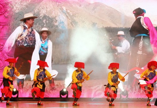 酒歌,藏語稱“羌諧”,流行于我州各縣。除主要幾種曲調普遍傳唱外,各地還有各自的唱法?!扒贾C”是在重大節(jié)日、迎接貴賓、親友歡聚時,興之所至,親友之間相互敬酒,對待貴賓則高舉酒杯以誠相敬。還有一種只唱不舞的酒歌,即“央金道道”。曲調優(yōu)美,音韻悠長。