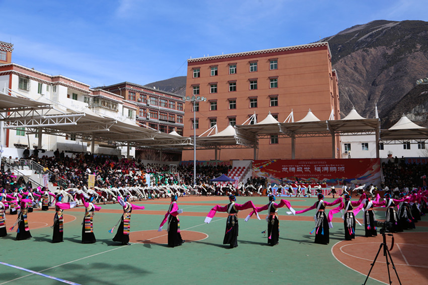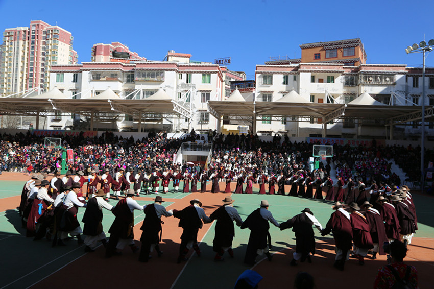 弦音聲動鬧新年,紅綾長袖舞春風,千人弦子鍋莊,唱出龍年大團圓,踏出幸福新舞步……2月13日,在巴塘縣全民健身活動中心舉行的春節(jié)暨藏歷新年系列活動“文化·點靚生活”——巴塘縣五彩藏鄉(xiāng)藝術(shù)周弦子鍋莊展演活動現(xiàn)場喜氣洋洋、人頭攢動,上千名群眾身穿節(jié)日盛裝,拉起弦胡,載歌載舞,共同慶祝新春佳節(jié),祈盼龍年國泰民安、風調(diào)雨順。圖為活動現(xiàn)場。 敖梅 李穎/文 格桑澤仁/圖