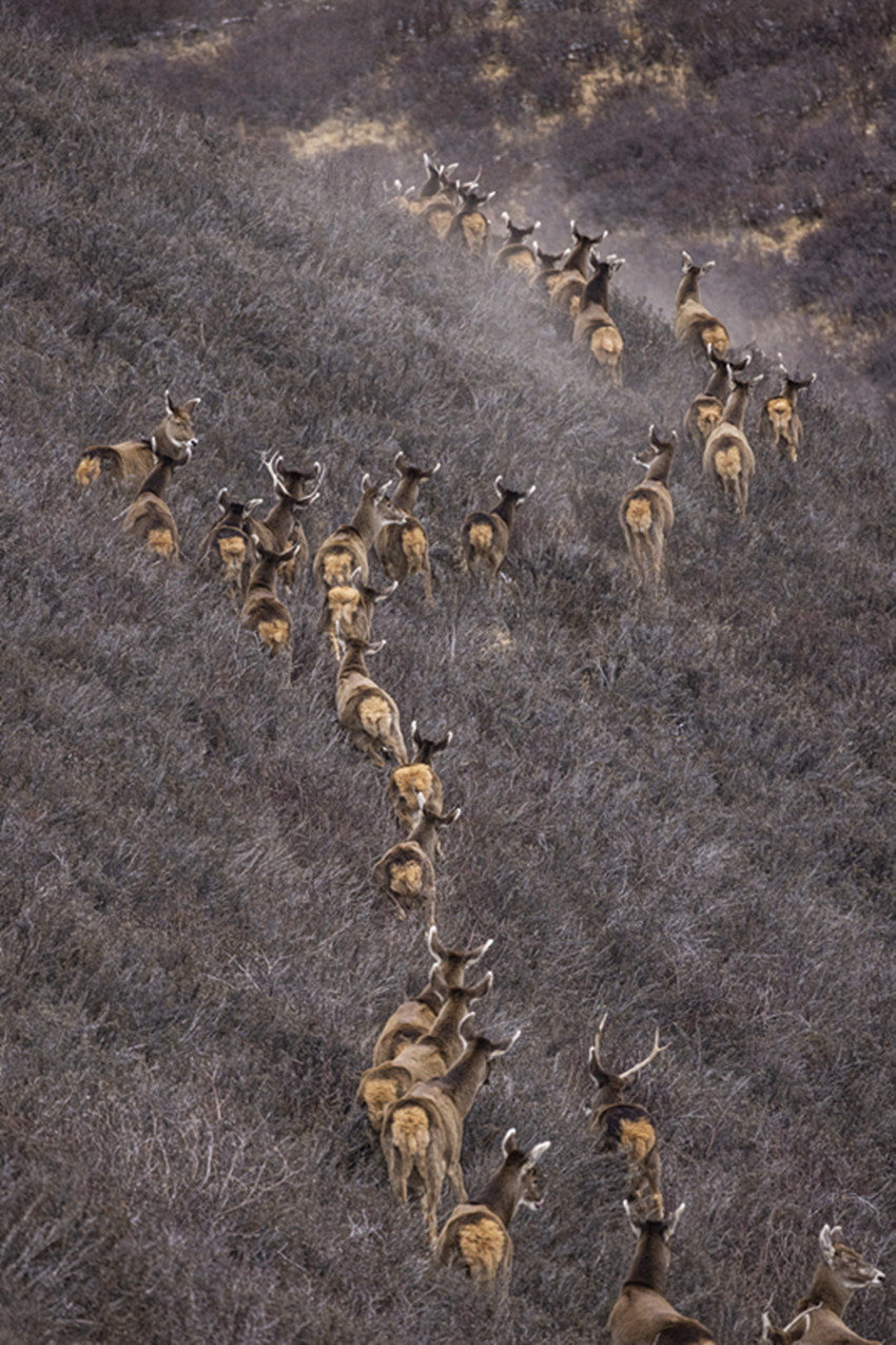 白唇鹿整齊行進遷徙。
