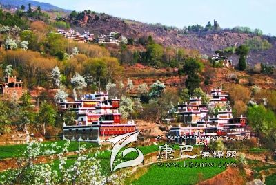 民居外表主要由棕白兩色構(gòu)成,白色的屋頂,白色的主墻,木結(jié)構(gòu)處多用棕色顏料染涂,其間配以紅、藍(lán)圖案,在藍(lán)天、白云、青山、綠水的映襯下,幻化成妙不可言的積木圖案。白色的房頂與寬敞的院壩里,身著艷麗藏裝的少女或身著絳紅色衣衫的喇嘛飄拂其間,給人一種“世外桃源”的感覺。